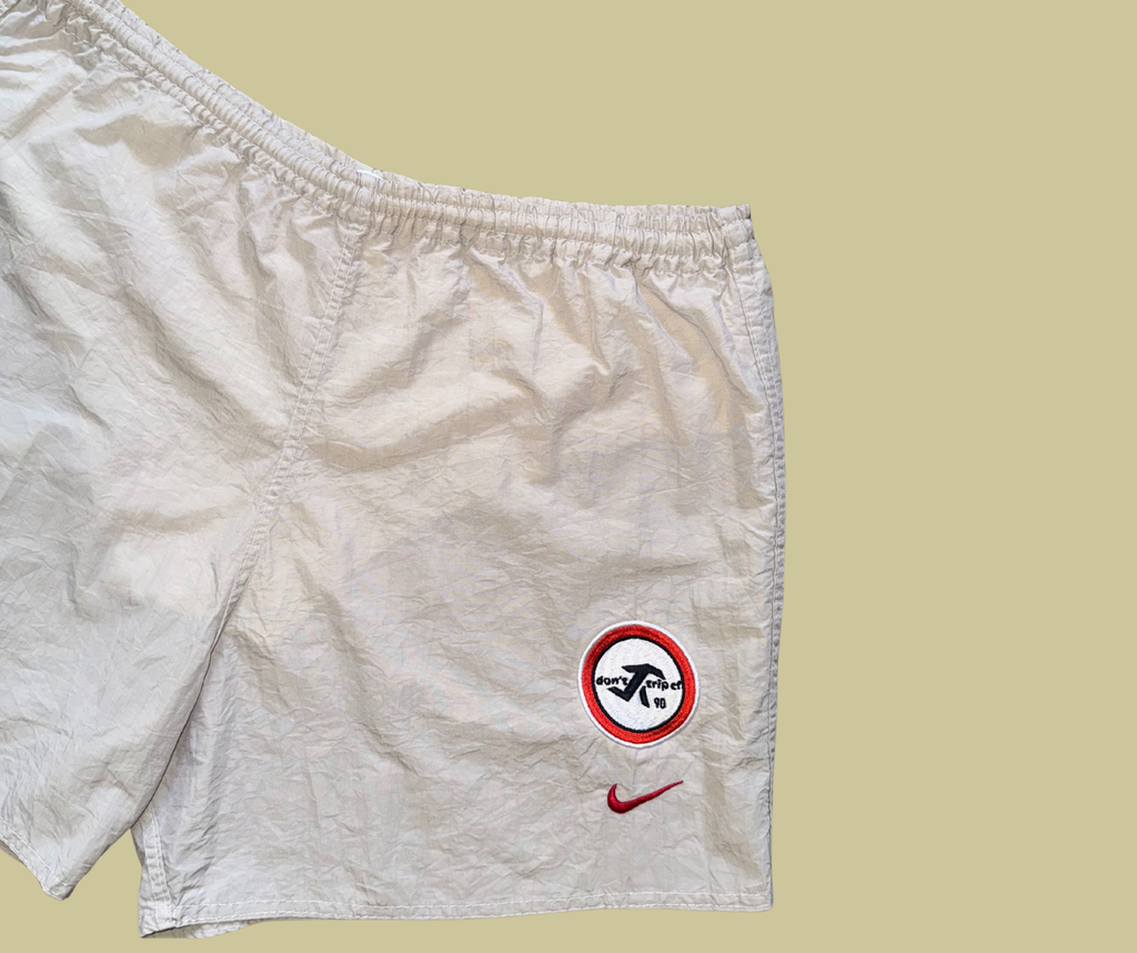 retro white nike training shorts with don't trip cf t90-inspired embroidered design