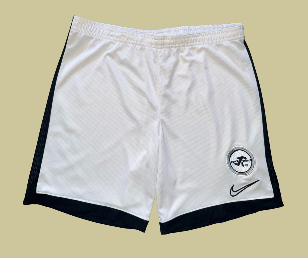 retro white nike training shorts with don't trip cf t90-inspired embroidered design