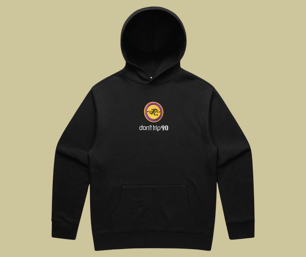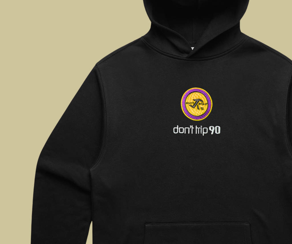 black hoodie with embroidered design inspired by the yellow and purple t90 ball