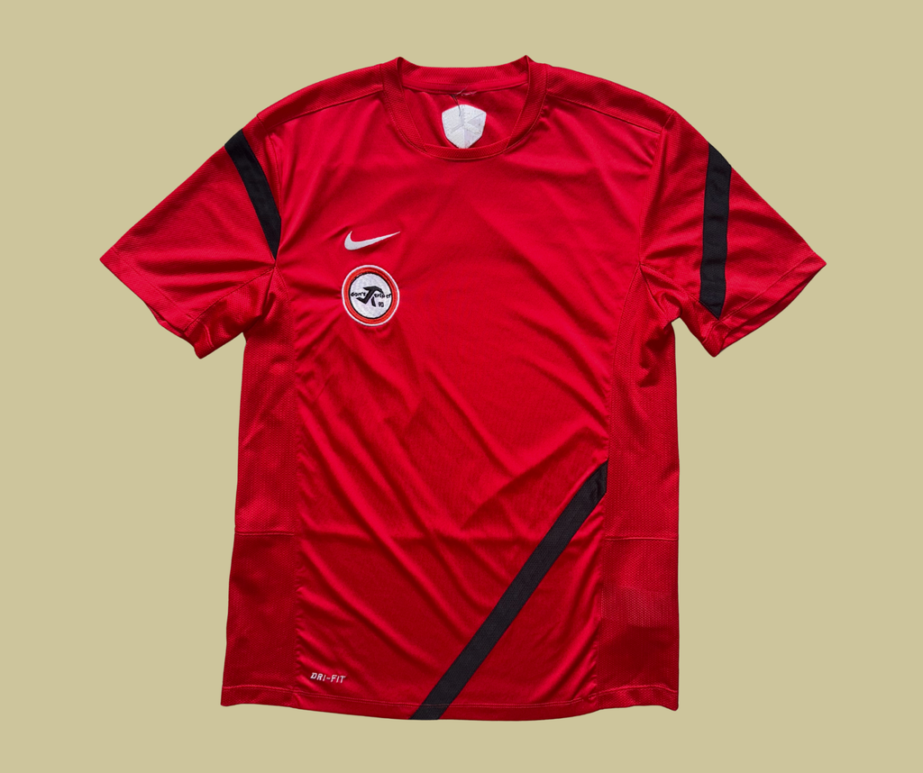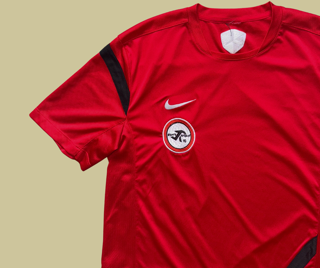 retro red nike training shirt with don't trip cf t90-inspired embroidered design
