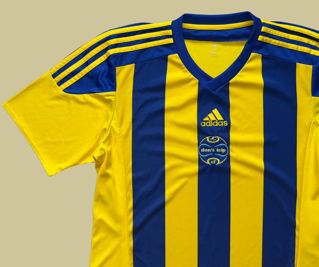 retro yellow/blue adidas training shirt with blue/yellow don't trip cf adidas-inspired embroidered design