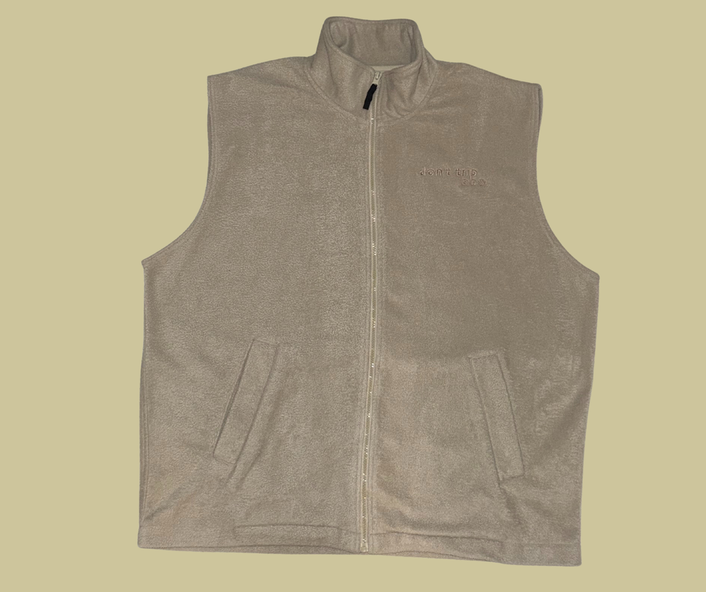 retro beige zip fleece vest with don't trip cf contrast embroidered design