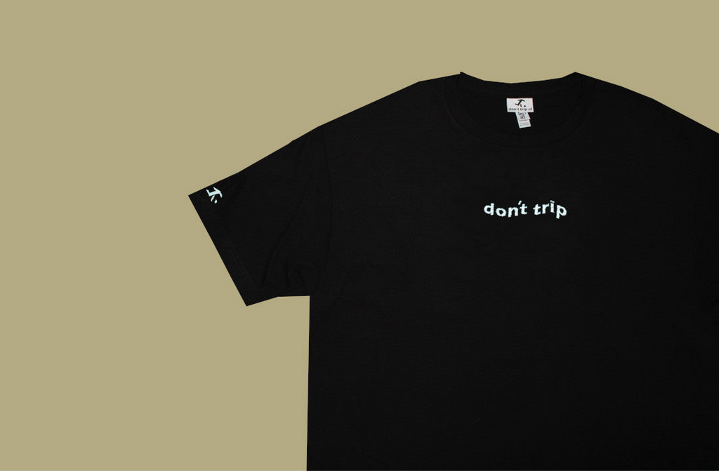 black tee with colour customisable "don't trip" embroidery in the centre and running man logo on the sleeve